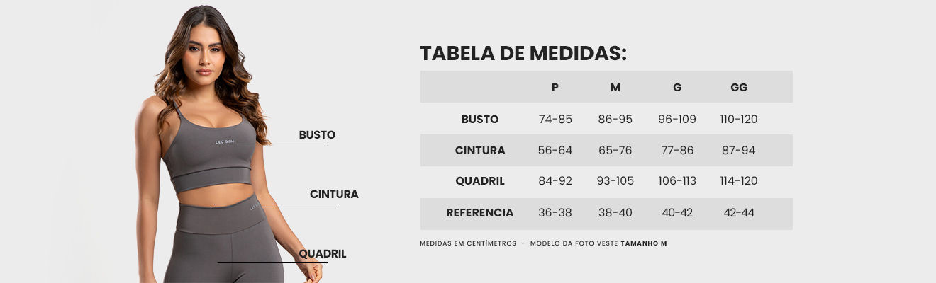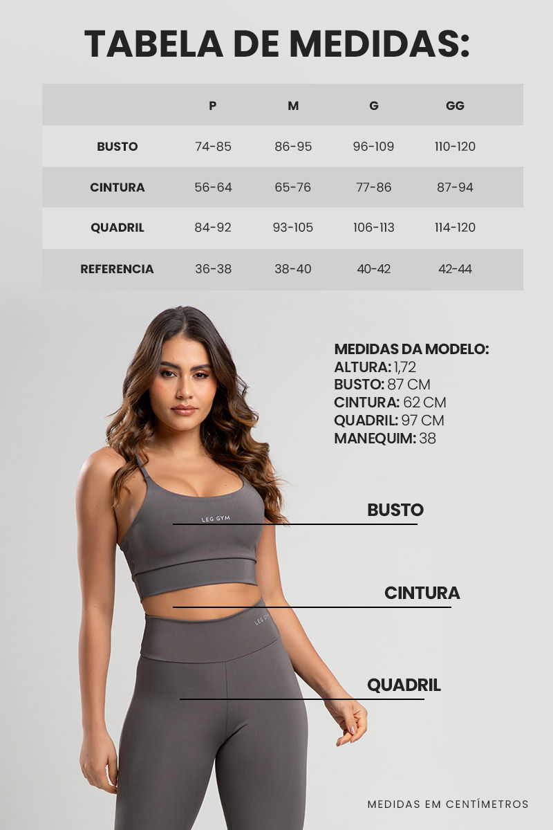 Compressão média a alta, valorizando as curvas e mantendo liberdade nos movimentos.