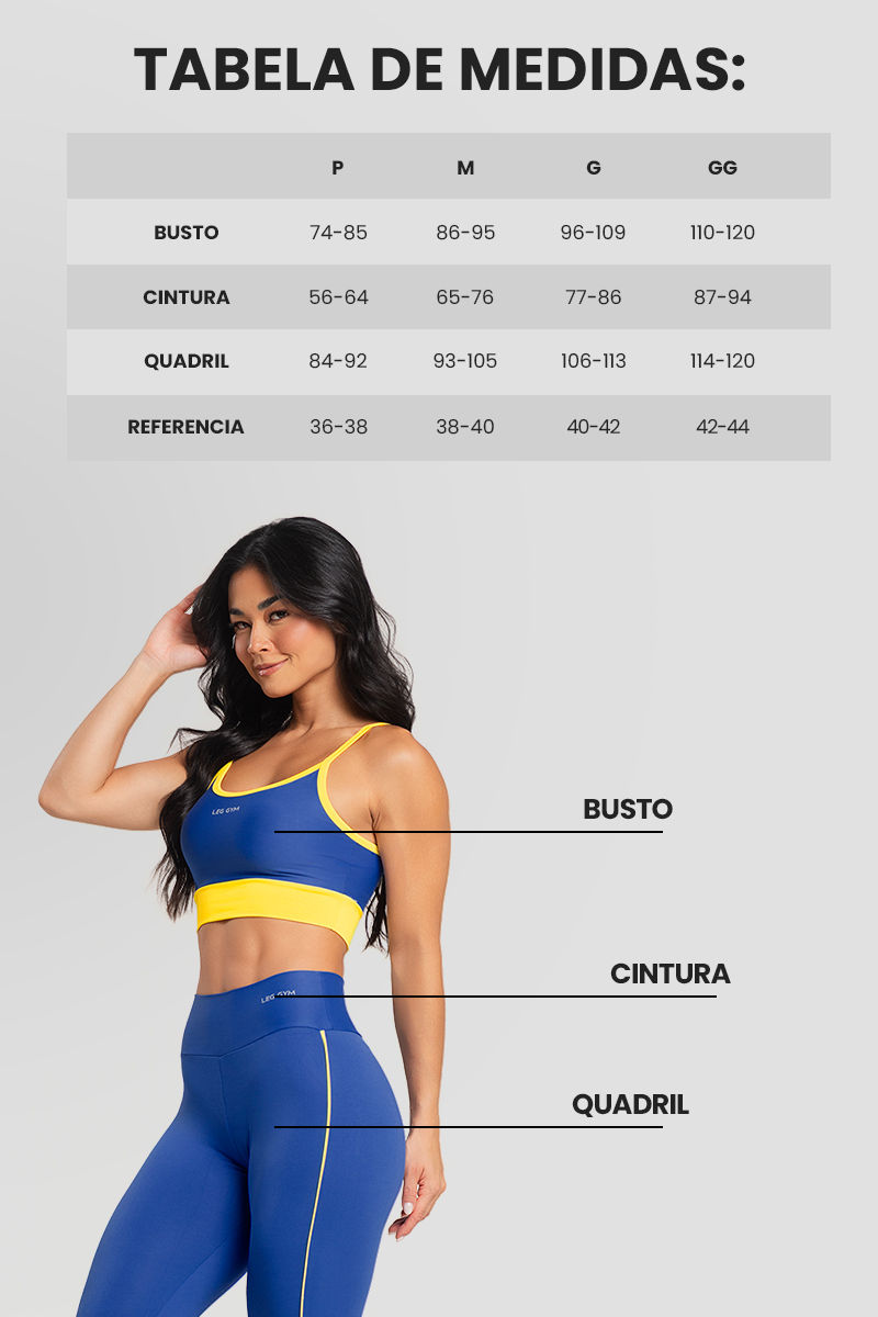 Feito com 84% Poliéster e 16% Elastano, resistente, confortável e com ótima elasticidade. A gramatura de 300 g/m² garante compressão firme que modela o corpo sem apertar.